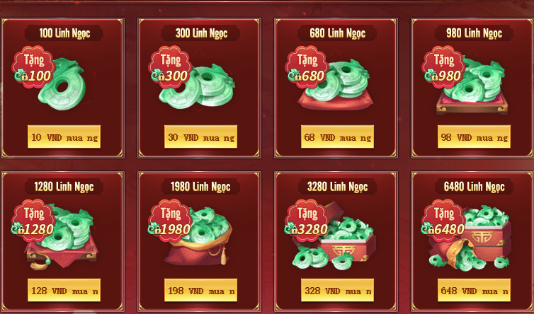 – Nạp Linh Ngọc (1k Xu = 10 Linh Ngọc = 10 Điểm VIP)